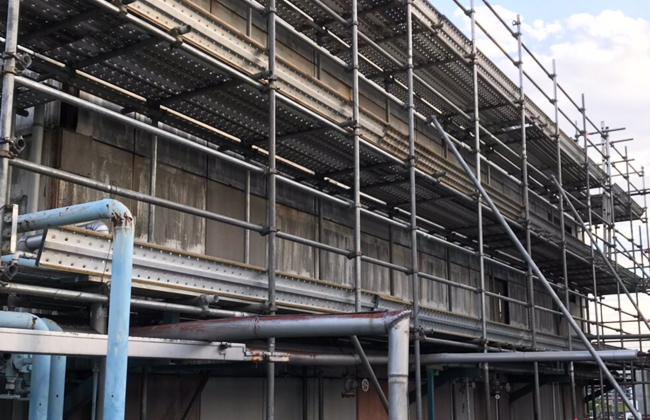 単管足場は、縦横の幅がある程度自由に決められるため、枠組足場が立てられない場所などに使用できます。