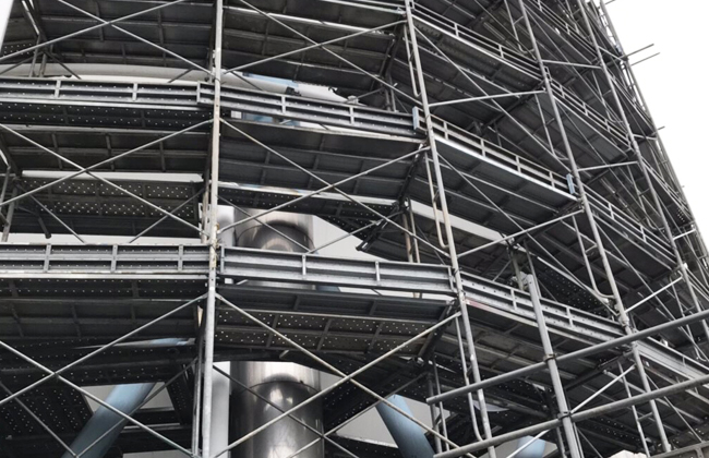 クランプ(金具)を噛み合わせ、ボルトで締めることでパイプ同士を接続し、そのまま足場として使ったり足場板を渡すための枠組みとして使ったりする仮設足場です。