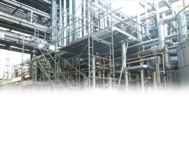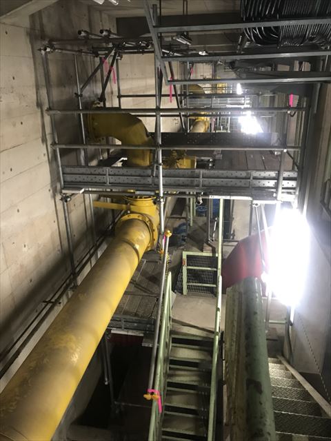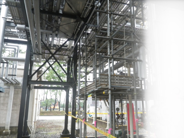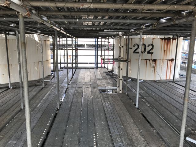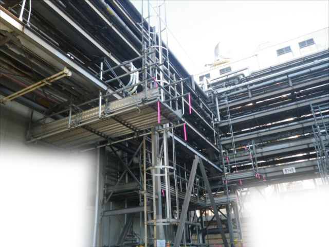 現場の状況に合わせ、広い場所はビデ枠足場、狭い場所は単管パイプ足場を