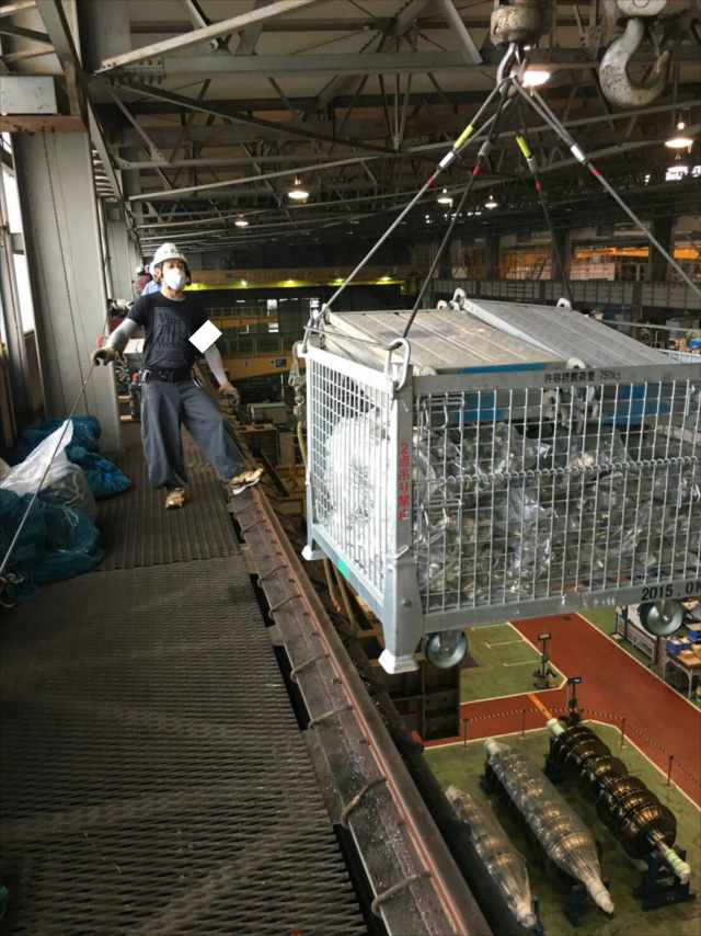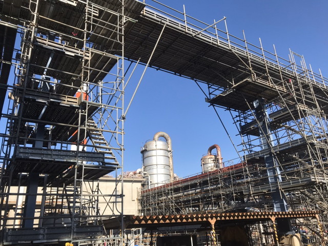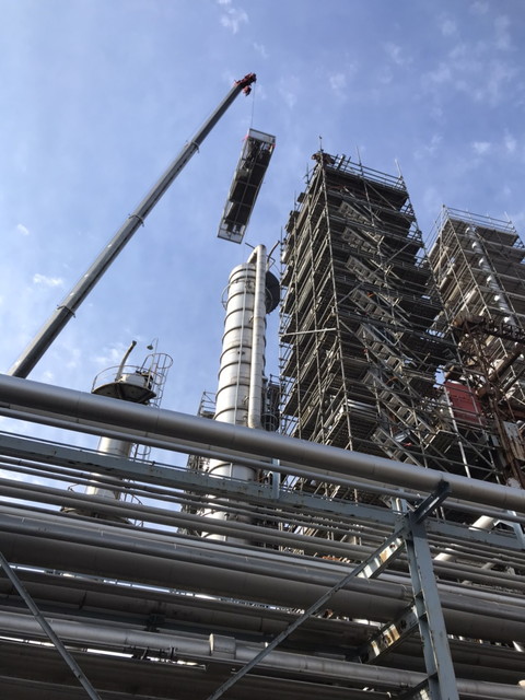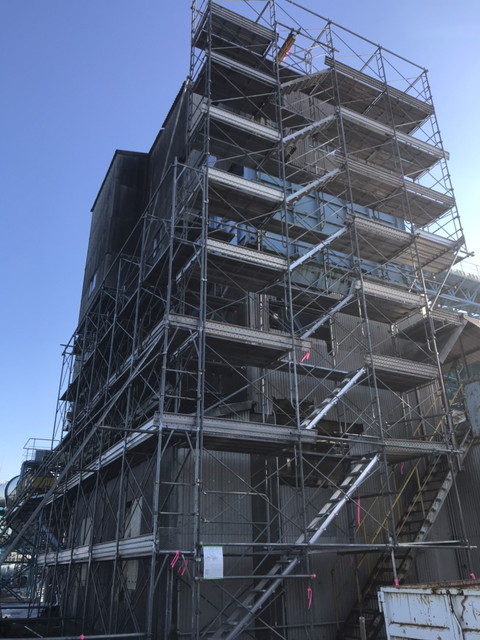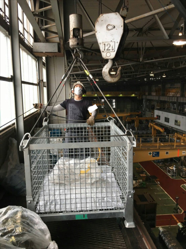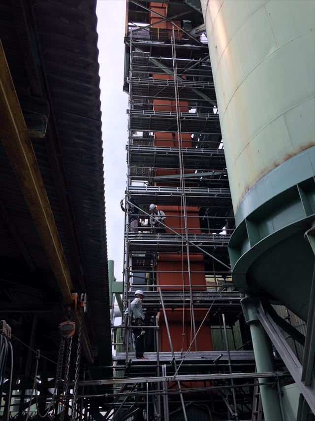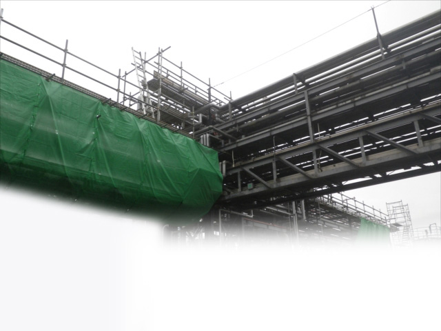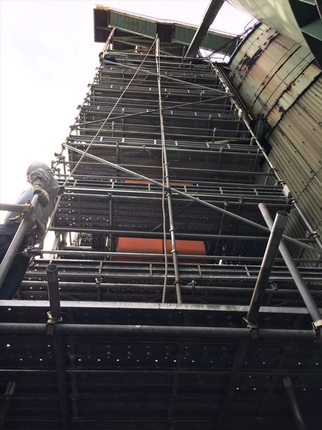 荷上げ用バケットを自社で持っていますので、大掛かりな足場でも効率よく組み上げ可能です。