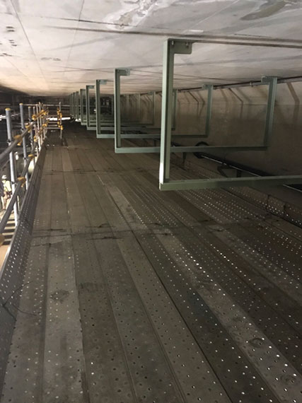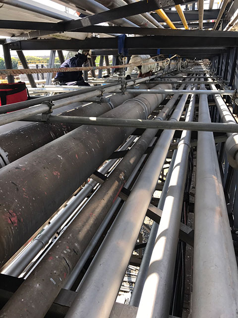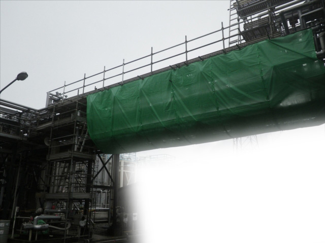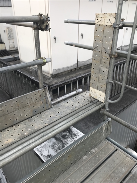 とても狭い場所での吊足場です。人数分の親綱を先行設置し、安全第一で作業しました。