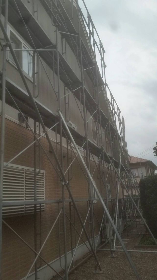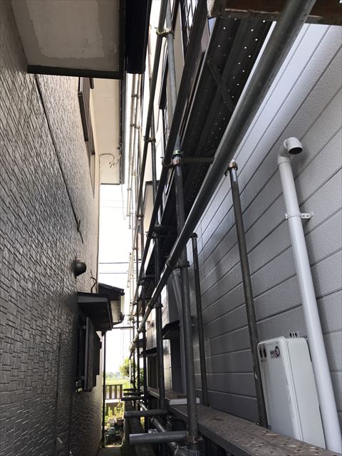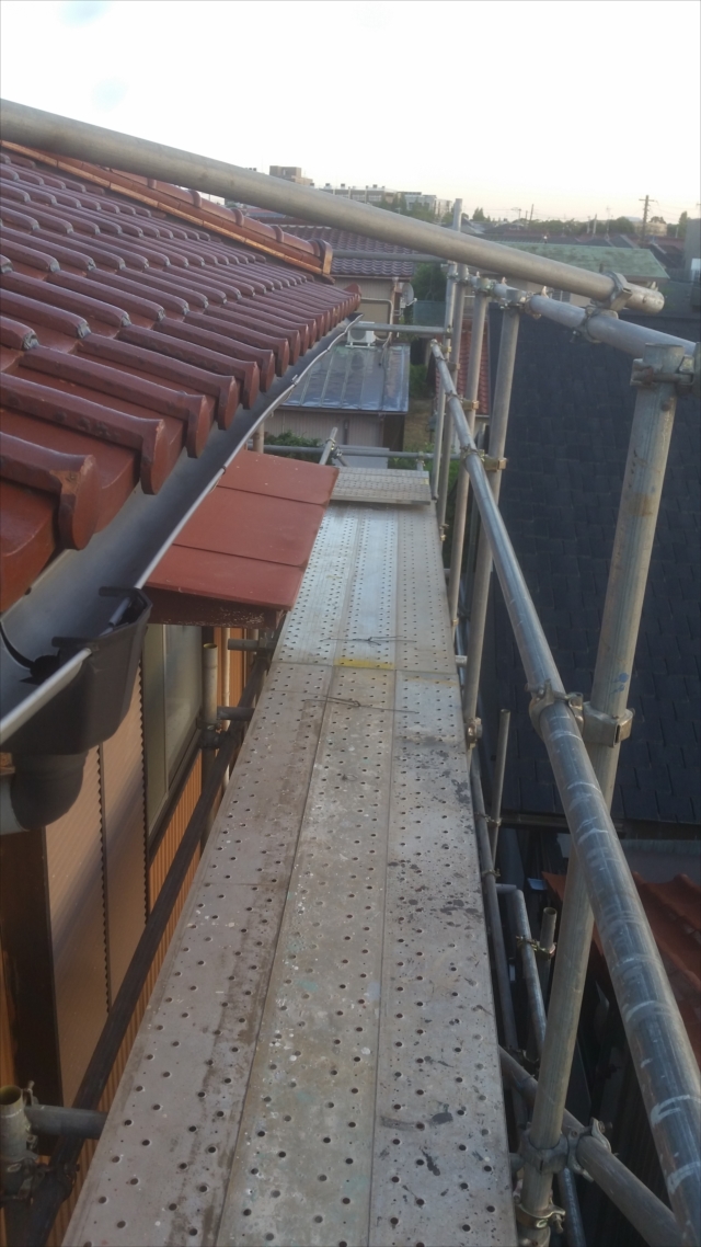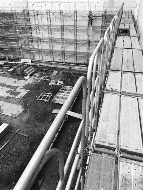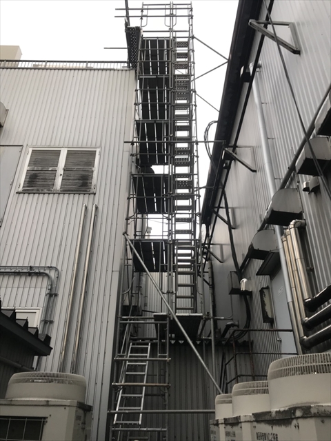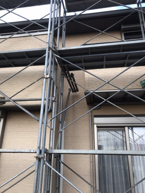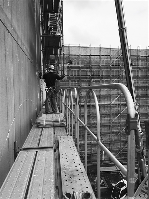 地震や強風で足場が揺れても建物に当たらない様に組み立て、昇降足場から、
